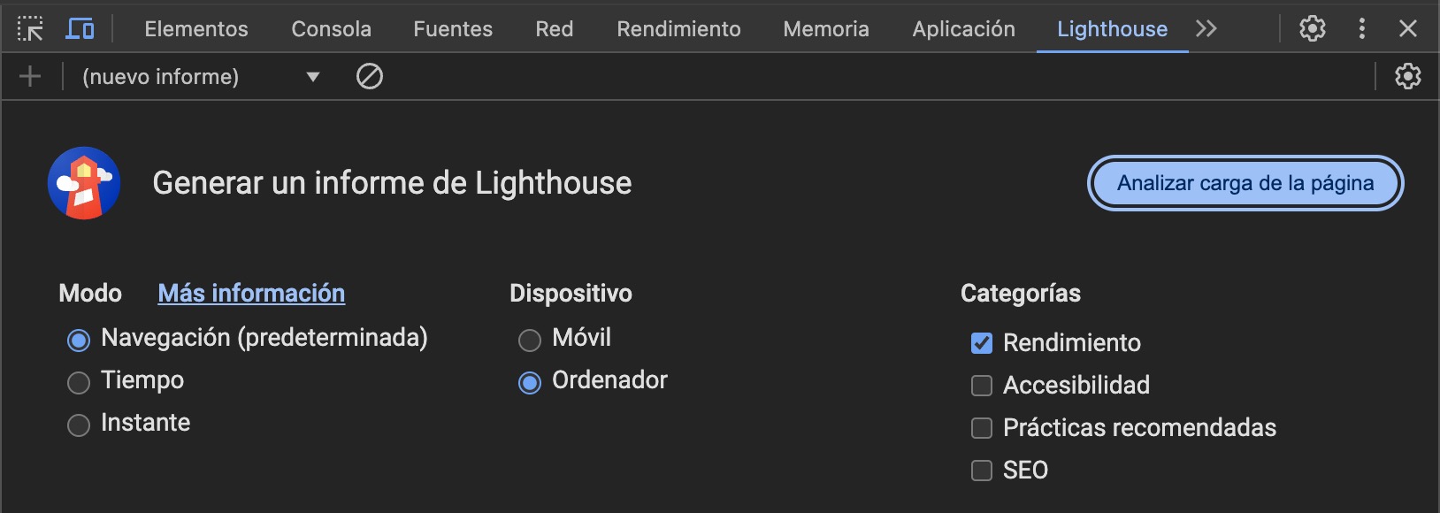Abre las herramientas para desarrolladores de Google Chrome, haz clic en la pestaña Lighthouse y genera un informe. Incluso hay muchas formas de configurar Lighthouse para medir el rendimiento en situaciones simuladas, como velocidades de conexión a Internet lentas o crear informes separados para dispositivos móviles y ordenadores de escritorio.