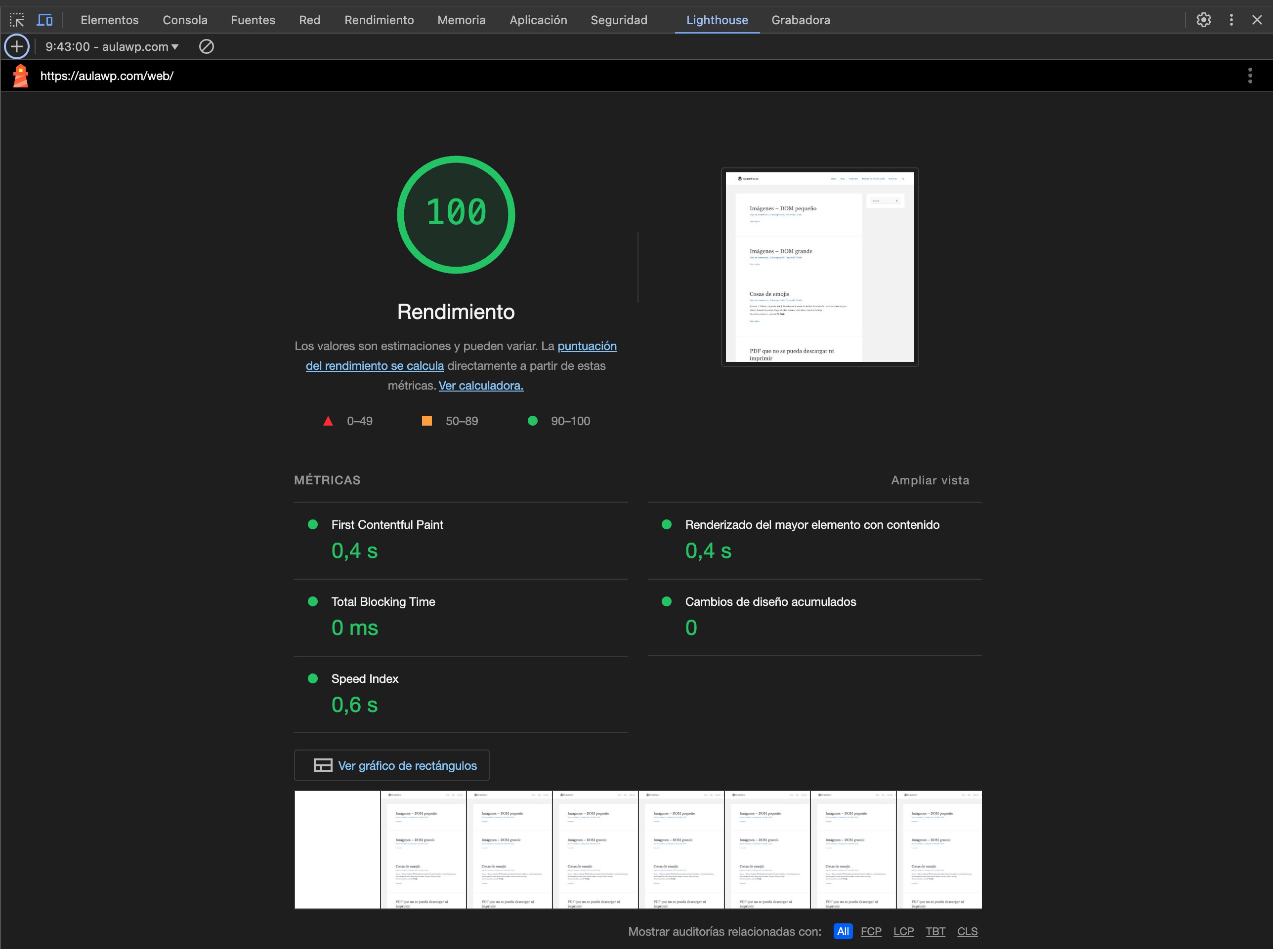 ¿Qué tal?, ¿te da gustirrinín tu puntuación en Lighthouse de 100 ¡Deberías disfrutarlo, te lo mereces, seguro! Pero también debes saber que solo estás mirando una parte del panorama de rendimiento.