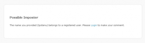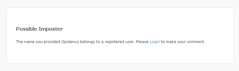 Afortunadamente acaba de salir un plugin que nos quitará más de un quebradero de cabeza. Impostercicle no tiene ajustes, simplemente lo instalas y lo activas. A partir de este momento, cuando alguien trate de hacerse pasar por un usuario registrado rellenando sus datos en el formulario de comentarios recibirá un bonito mensaje de «posible impostor«, no permitiendo la publicación del comentario.