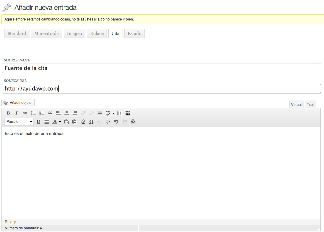 - Los formatos Estándar, Minientrada e Imagen no alteran el editor, con su campo de título y la caja de introducción de texto.