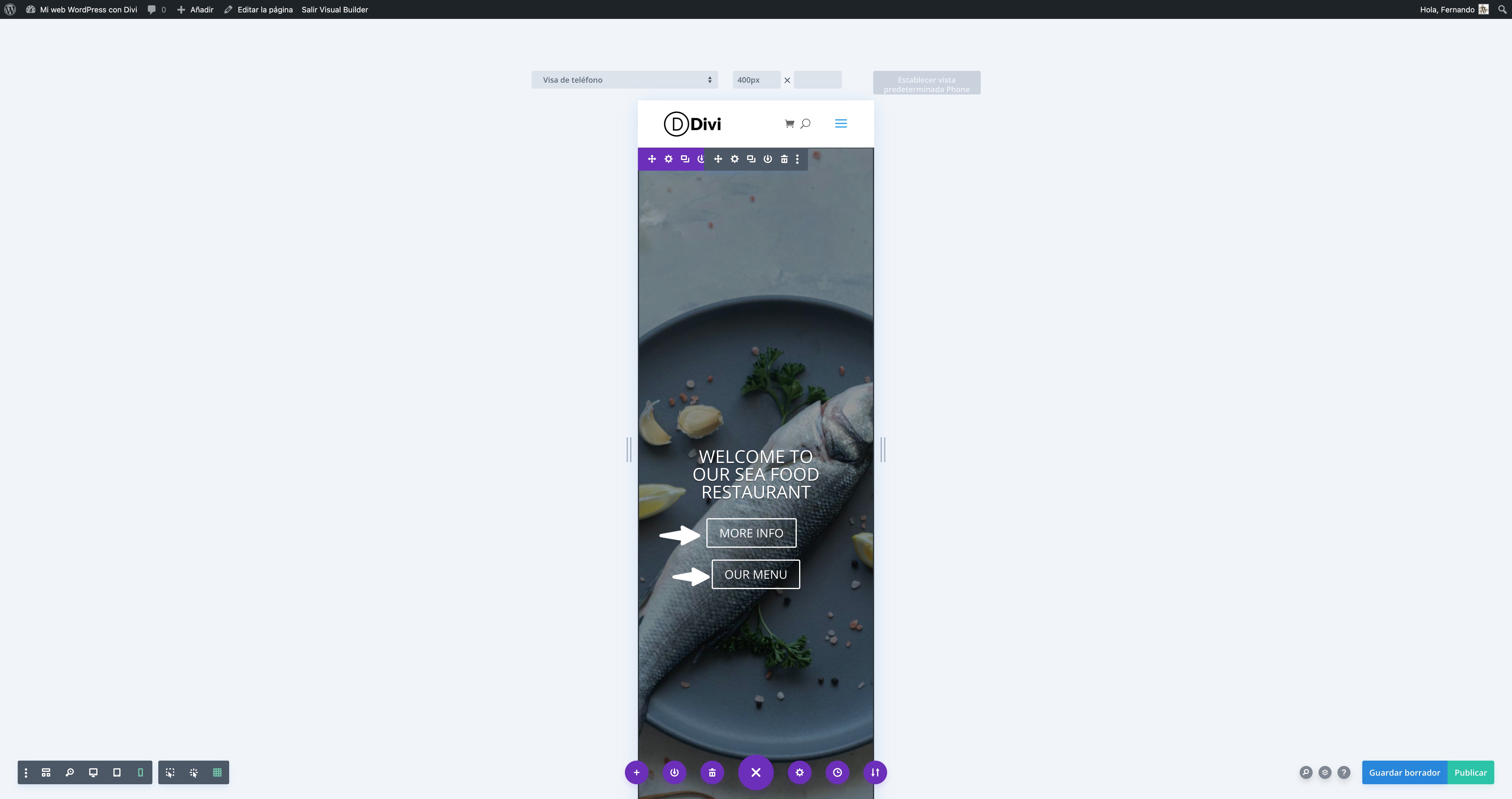 Pero, ah amigo, la cosa cambia si ves este mismo módulo, con sus dos molones botones, en un dispositivo móvil. Por obra y gracia de los demonios de Internet, y en este caso de Divi en concreto, los botones salen desalineados, dando una pobre imagen del módulo, y en consecuencia del diseñador, sí, tú.