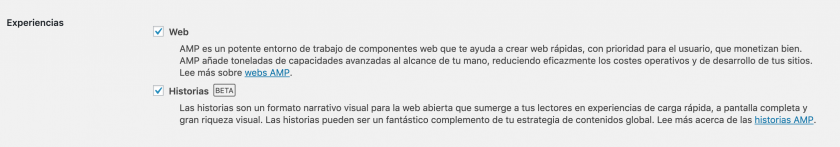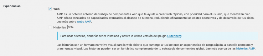 Así que instala y activa el plugin Gutenberg (sí, aunque ya tengas editor de bloques, de momento es un requisito ya que necesita funcionalidades que aún no están en el editor de bloques incluido en WordPress) y vuelve a la página de ajustes de AMP para activar las historias AMP.