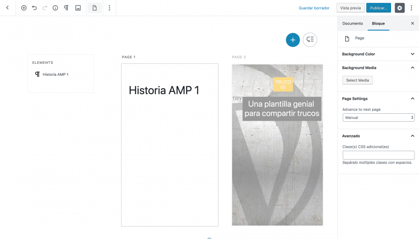 Al crear historias AMP en WordPress se generan unas contenidos especiales de AMP Stories en los que puedes añadir varias páginas por historia, cada una con contenido enriquecido.