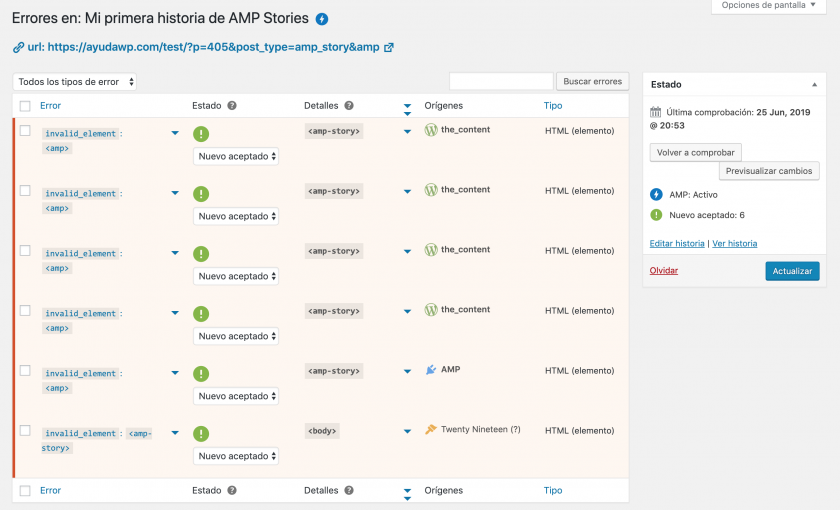 Pero, a pesar de ello, es interesante, incluso recomendable, que empieces a trastear con ello, sin arriesgarte aún a publicar AMP Stories, al menos sin las comprobaciones previas de validación AMP.