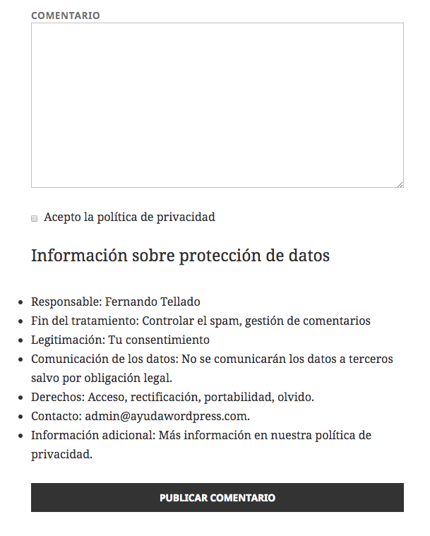 /** Primera capa privacidad en comentarios **/ $acceptance = '<p class="comment-reply-title comentarios">Información sobre protección de datos</p> <p class="comment-subscription-form"><ul><li>Responsable: Fernando Tellado</li> <li>Fin del tratamiento: Controlar el spam, gestión de comentarios</li> <li>Legitimación: Tu consentimiento</li> <li>Comunicación de los datos: No se comunicarán los datos a terceros salvo por obligación legal.</li> <li>Derechos: Acceso, rectificación, portabilidad, olvido.</li> <li>Contacto: <a href="mailto:[email protected]" title="Contacta">[email protected]</a>.</li> <li>Información adicional: Más información en <a href="https://ayudawp.com/muylegal/" title="Política de Privacidad">nuestra política de privacidad</a>.</li></ul></p>'; function ft_acceptance_comments( $form ) { global $acceptance; return $form . $acceptance; } add_action( 'comment_form_field_comment', 'ft_acceptance_comments' );