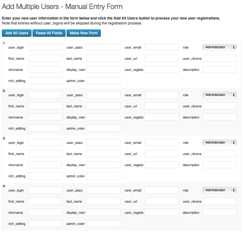 Si tienes una web en la que quieres añadir muchos usuarios de manera rápida WordPress por defecto no ofrece ningún modo de hacerlo así, te toca ir añadiendo uno a uno, rellenando los campos obligatorios de cada uno.