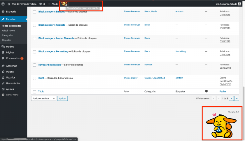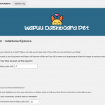 Una vez instales y actives el plugin Wapuu Dashboard Pet, puedes elegir dónde mostrar un wapuu (en la barra superior de admin, en el pie de página de administración o en ambos sitios a la vez), y ya solo por eso mola, el wapuu es precioso, pero ahí no acaba la cosa.