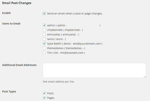 Y esto es muy fácil conseguirlo con el plugin Email post changes, que avisa a los usuarios que tu especifiques en su página de ajustes cuando haya un cambio en alguna entrada. En la pagina de ajustes también puedes especificar a qué usuarios existentes, u otros que añadas a la lista, se enviará un correo electrónico.