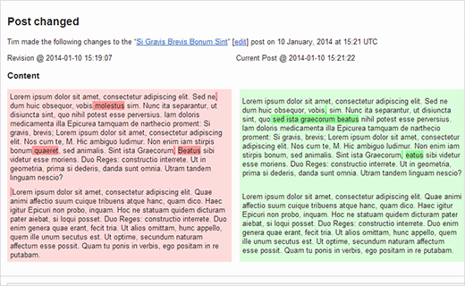 Lo mejor de todo es que el mail no te avisa simplemente de que ha habido cambios sino que muestra exactamente qué cambios se han hecho y quien los ha hecho, lo que hace de este plugin una herramienta fantástica para cualquier administrador o editor de un sitio multiusuario.