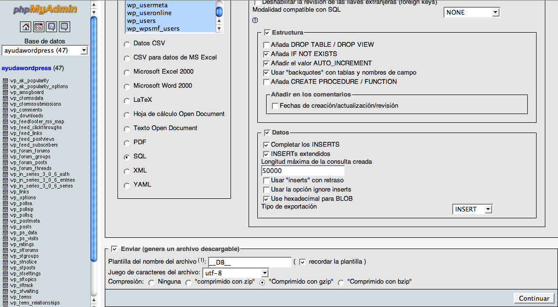Pues bien, en la parte superior tienes el acceso que buscas, el botón «Exportar«. Si lo pulsas te abrirá una ventana llena de opciones disponibles, como el formato de exportación, estructura y muchas otras cosas que no debes tocar si no sabes lo que haces. Lo único que debes asegurarte que está marcado es el formato de exportación (SQL) y la compresión gzip, por compatibilidad y para acelerar la descarga del archivo.