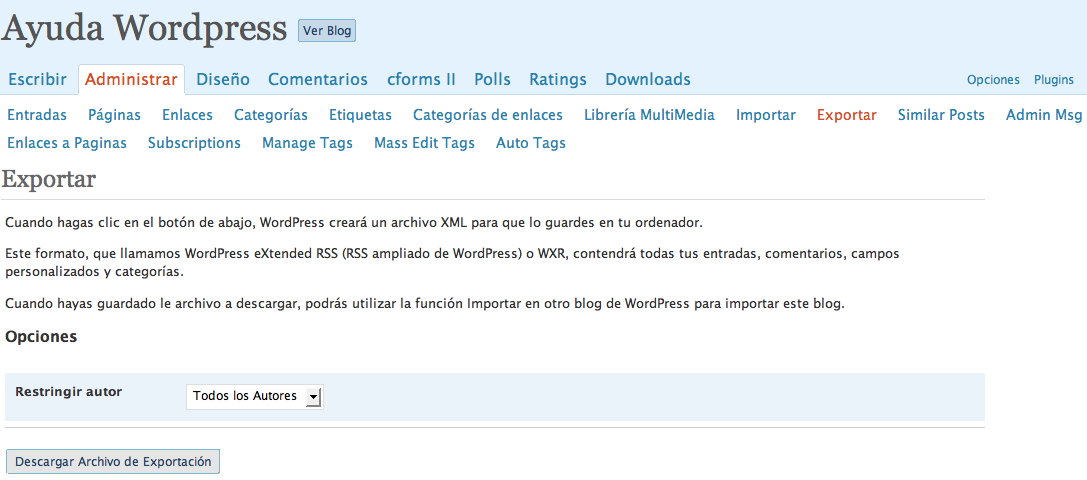 Vas a poder exportar las entradas de todos los redactores del blog o uno a uno, interesante si tienes muchas entradas y quieres evitar problemas de importación en caso de tener que recuperarlas. Digo esto porque el tamaño del fichero de importación tiene un límite de bytes y tiempo empleado para la importación, y si tu blog es veterano o escribes mucho podrías encontrar algún problema a la hora de importar tus entradas.