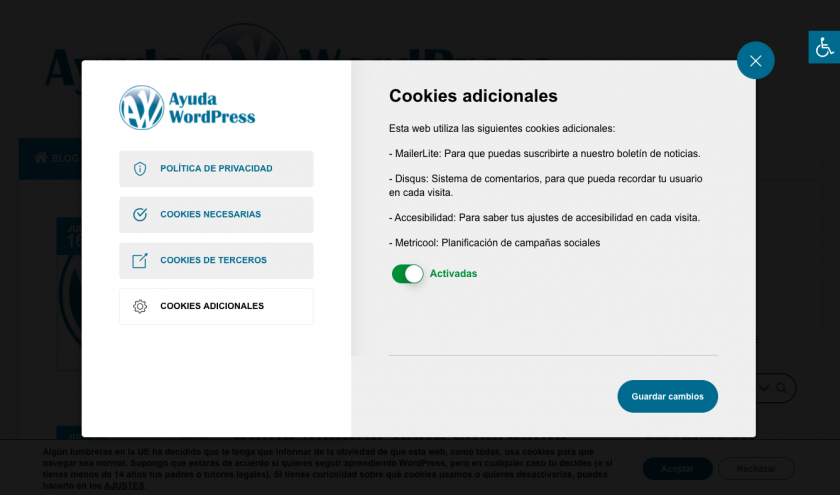 Activa el consentimiento de las cookies de terceros o adicionales en el plugin