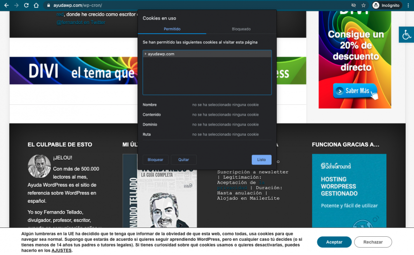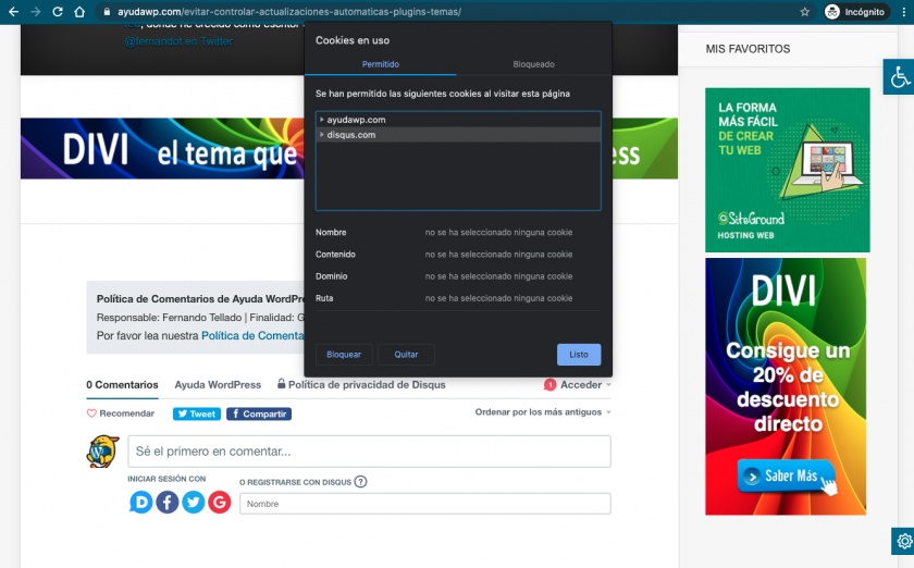 Ahora comprueba de nuevo visitando con tu navegador de incógnito una entrada cualquiera de tu sitio y verás que no se cargan las cookies de Disqus hasta que no dés el consentimiento.