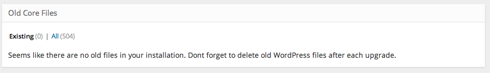 Una vez instalado ve a «Herramientas -> Old core files» y el plugin te mostrará inmediatamente si tienes archivos obsoletos o no. Si hay archivos antiguos que puedes borrar con seguridad sabrás cuales son y podrás borrarlos por FTP o desde el panel de tu alojamiento, algo que de otro modo quizás no harías, pues no te atreverías a eliminar archivos, al no saber seguro si aún sirven o no para algo.