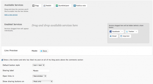 Hace un rato he descubierto una nueva opción en los ajustes de mis blogs en WordPress.com: Compartir. Esta nueva pantalla en tu escritorio permite – por fin – ofrecer un sistema sencillo para que tus lectores compartan tus entradas en las redes sociales más habituales (Facebook, Twitter, Digg, Stumbleupon, Reddit), además de imprimir, enviar por email o re-publicar tus entradas con el polémico sistema del que hablamos en su día.