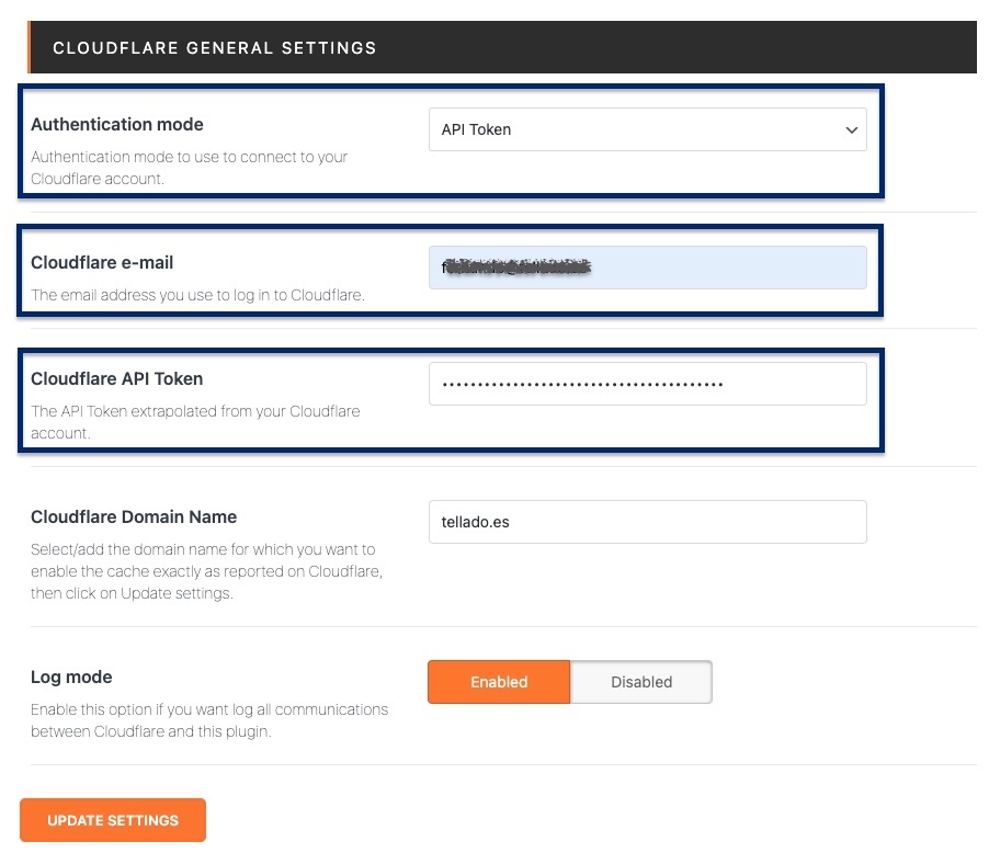 En la página de ajustes vamos a configurar la conexión de nuestro sitio WordPress con la API de CloudFlare mediante nuestro recién creado token.