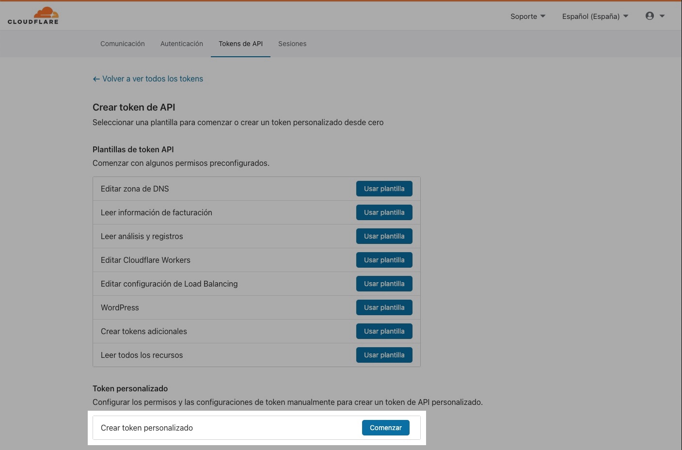 Crea un token personalizado de la API de CloudFlare