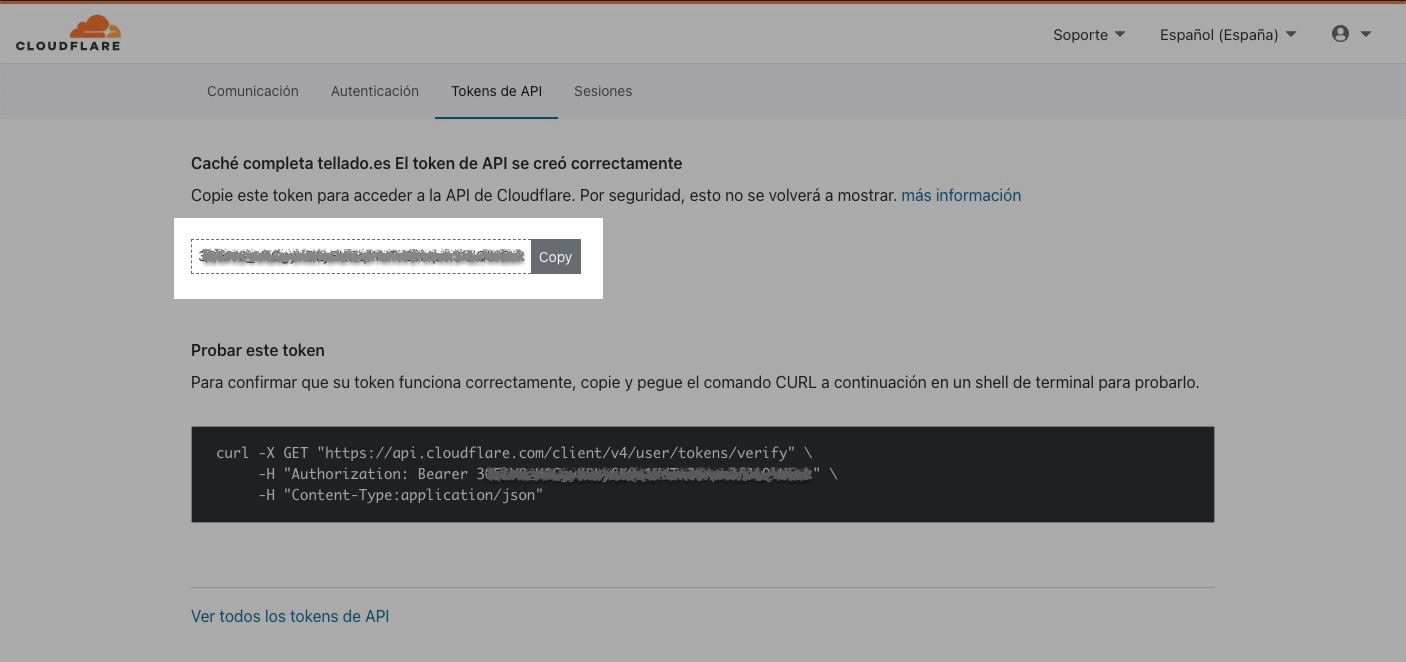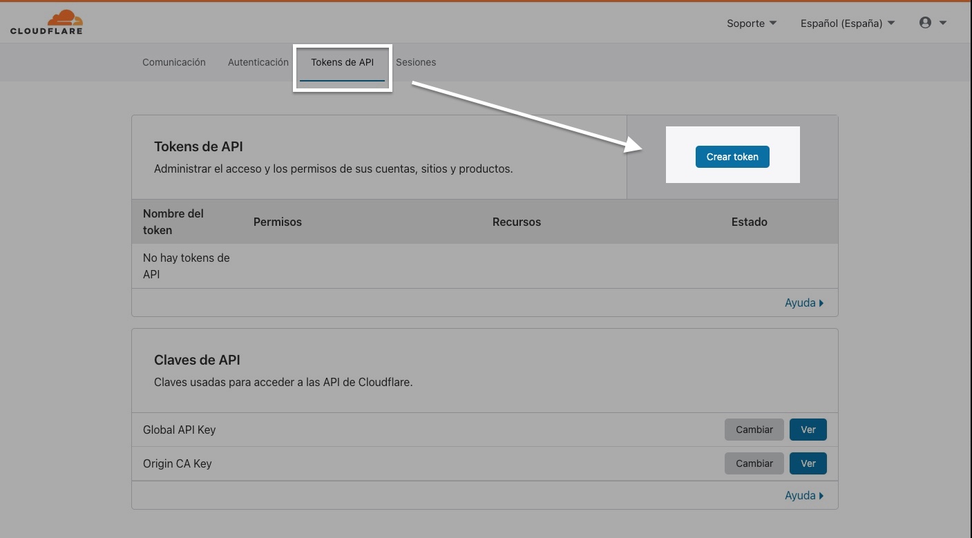 Ve a la página de tokens de la API de CloudFlare, en este enlace, y crea un nuevo token. Vas a ver muchas capturas de pantalla pero en realidad es muy sencillo y no se tarda casi nada en hacerlo.