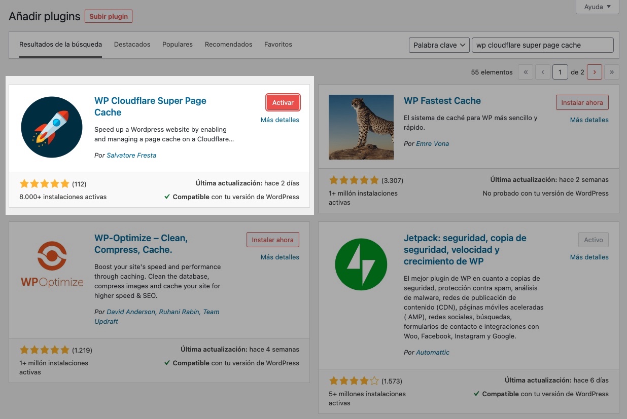 Instala el plugin de super caché de CloudFlare