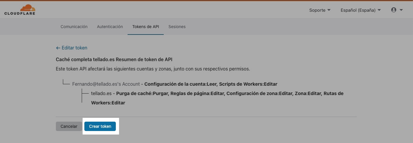 En la siguiente pantalla revisa la configuración y, si todo está correcto, pulsa en el botón de «Crear token».