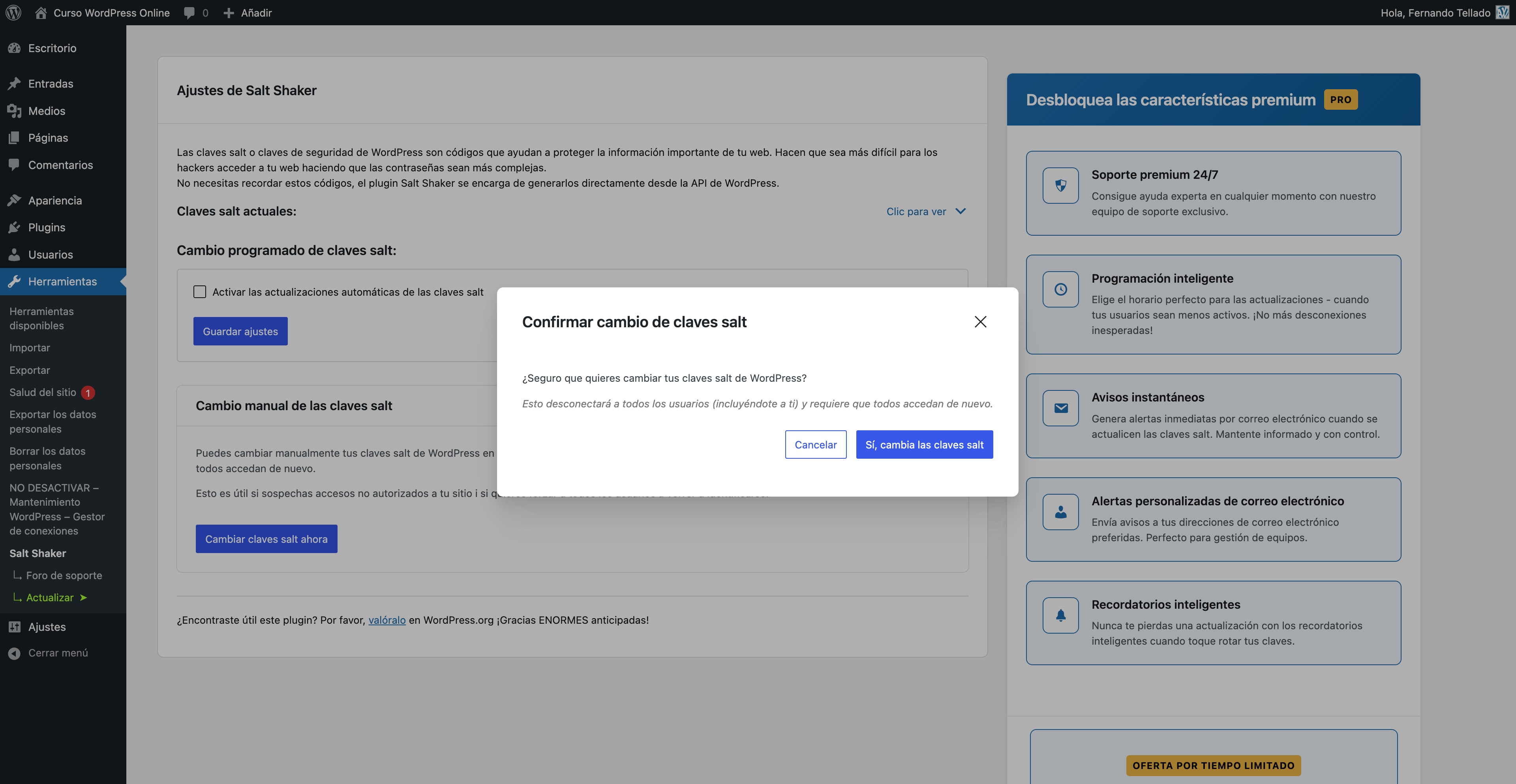 Nada más instalarlo añade una página de configuración en el menú de herramientas del escritorio de WordPress, en el que, además de poder visualizar las claves salt existentes actualmente te permite: