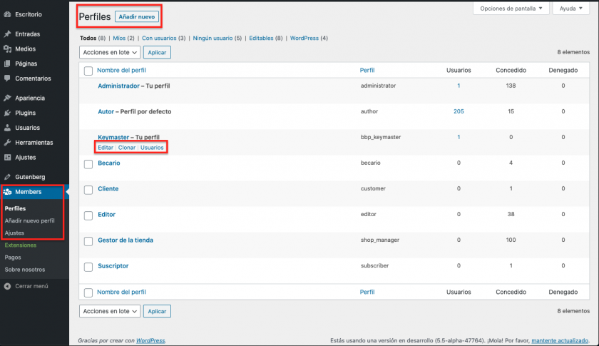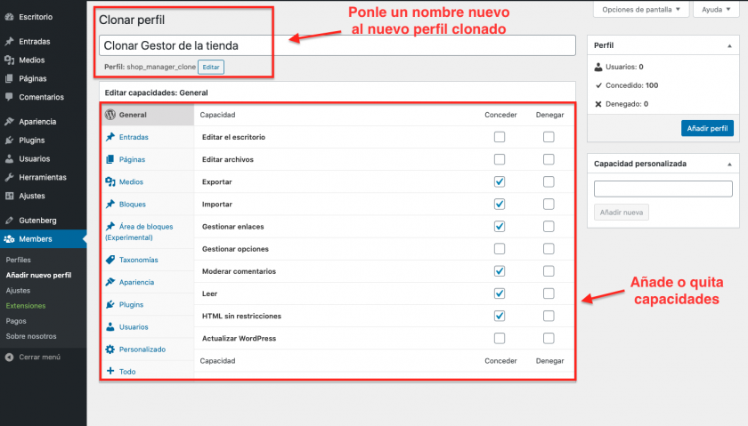 Una vez instalado y activo crea un nuevo menú de administración (Members) en el que puedes tanto modificar (añadir o quitar) capacidades a los perfiles existentes como crear nuevos, con capacidades personalizadas o clonar existentes.