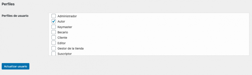 Luego solo te queda asignar el nuevo perfil al usuario o usuarios, como lo harías para cambiar cualquier perfil, editando el usuario, en este caso en la nueva caja que incorpora al editor del perfil de usuario el plugin Members.
