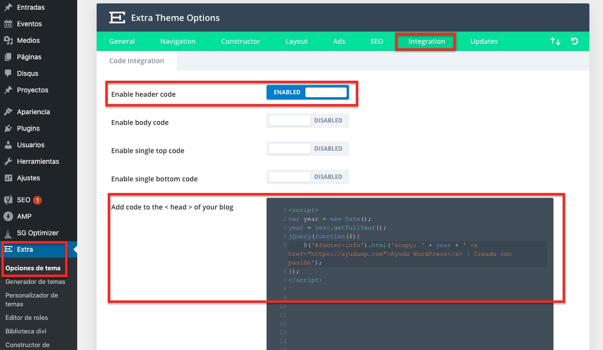 Teniendo esto claro, el mejor y más fácil modo de añadir este código es en los ajustes del propio tema Extra.