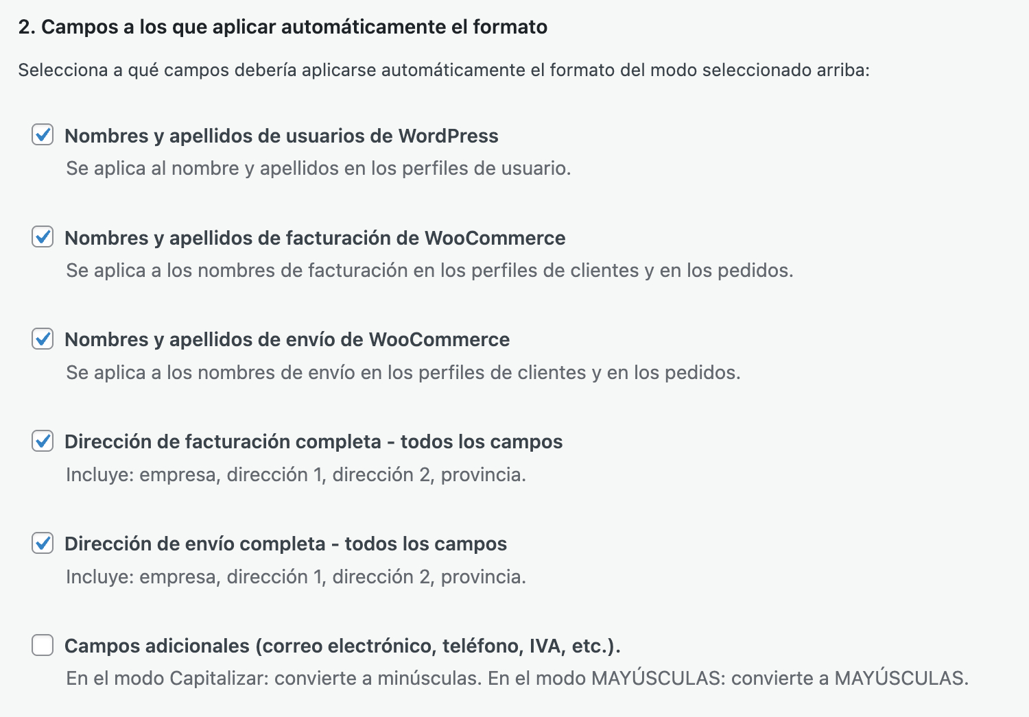 No todos los sitios tienen las mismas necesidades. Por eso el plugin te permite elegir con precisión qué campos quieres formatear automáticamente: