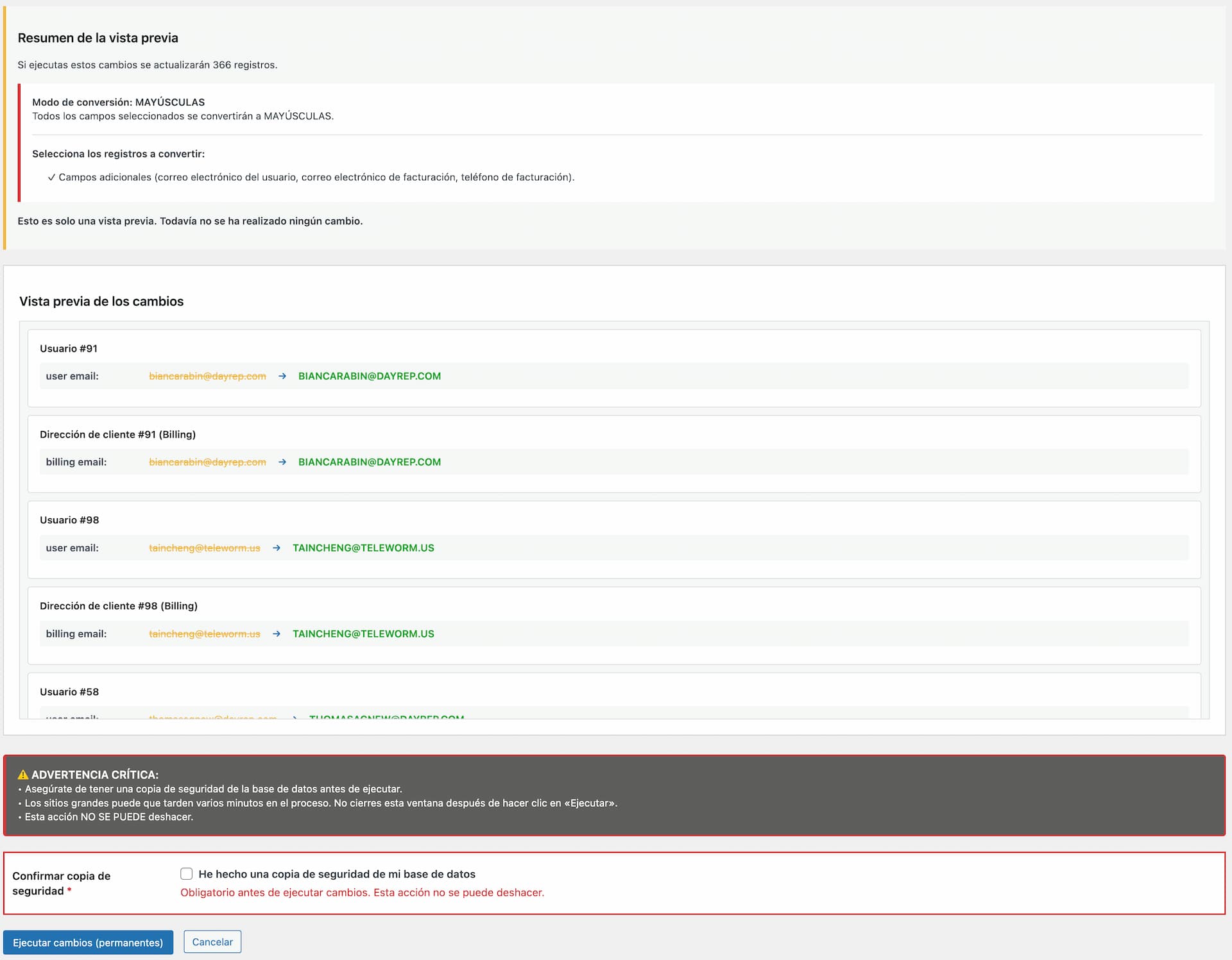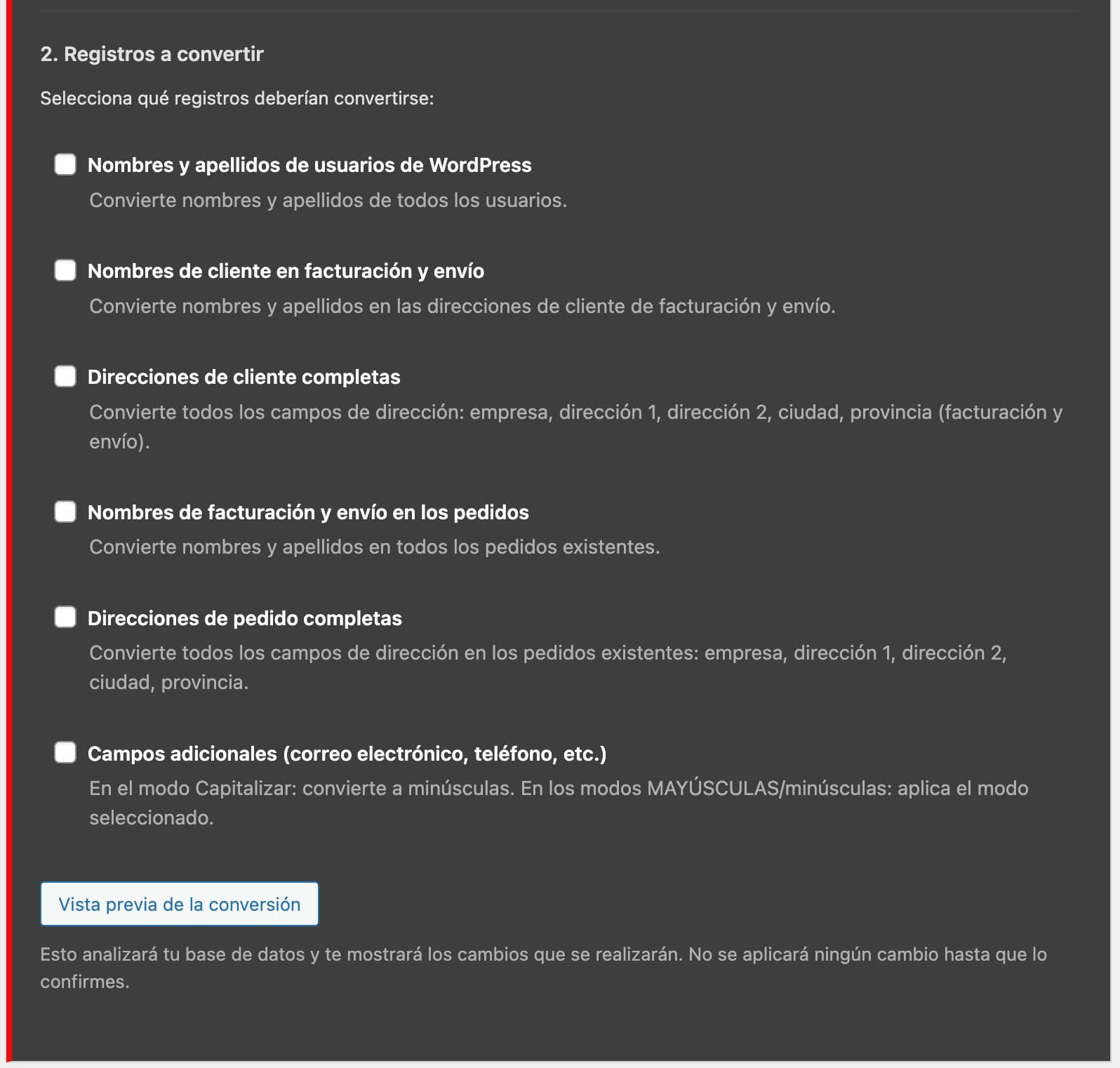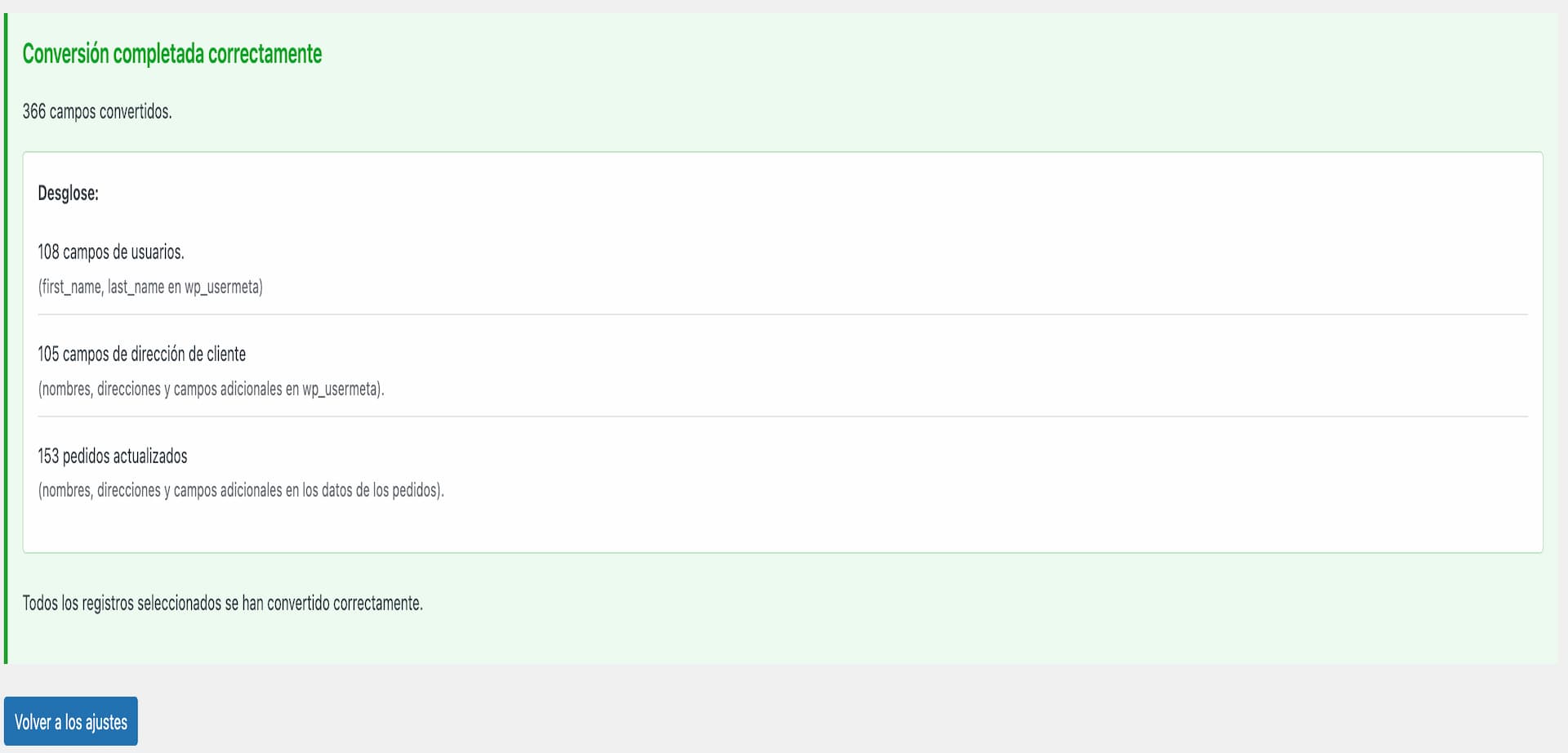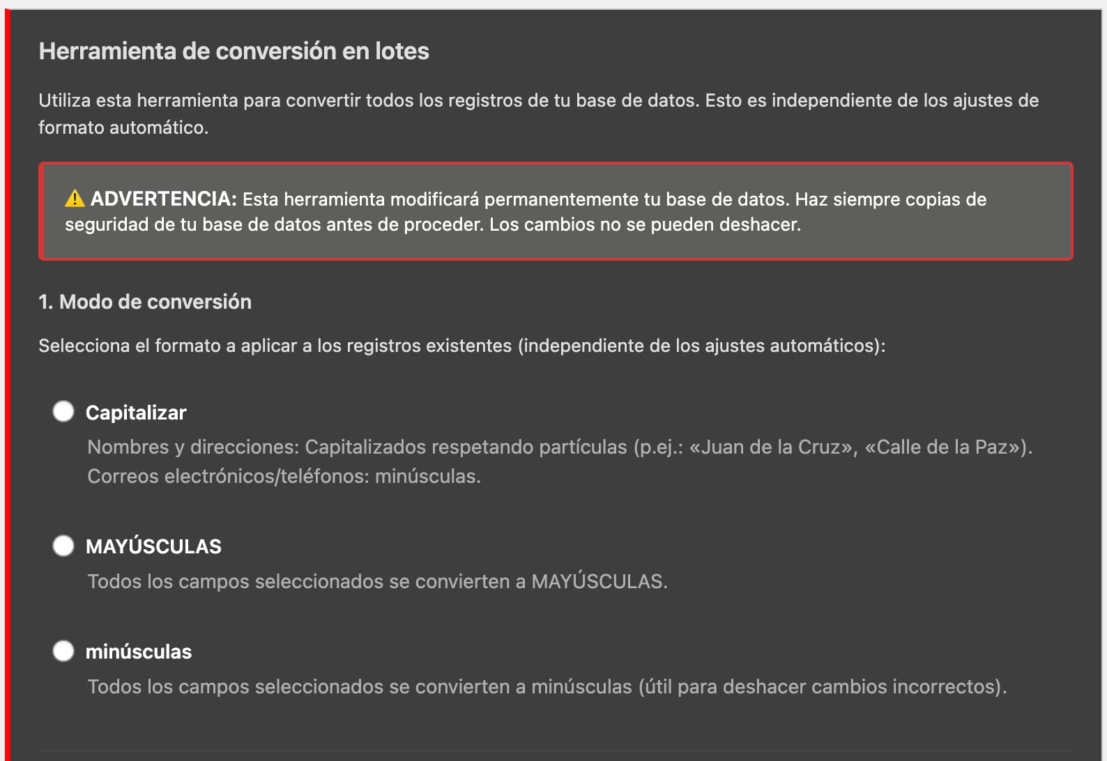 Pero claro, ¿qué pasa con todos los clientes que ya tienes registrados? Para eso el plugin incluye una herramienta de conversión por lotes que te permite:- Convertir todos los nombres y direcciones existentes de golpe.