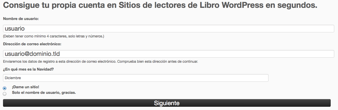 Lo único que te quedará por hacer es anunciar la buena nueva al mundo y ofrecer una página desde donde los usuarios puedan crear su nuevo sitio en tu dominio, para lo que debes ofrecer un enlace a la ruta tusitio.es/wp-signup.php desde donde se crean los nuevos sitios de la red.