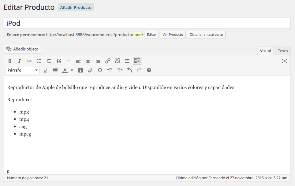 Aunque todas las secciones de la página de creación de un producto tienen importancia, sin la información del producto no tienes nada más que texto y unas cuantas bonitas fotos. Es aquí donde de verdad ofreceremos algo que comprar así que es importante especificarlo correctamente.