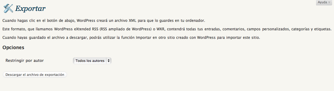 Lo primero es exportar las entradas, comentarios, etiquetas, etc de tu WordPress (piénsalo bien, el no lo haría, ¡ah! ¿que quieres seguir?, vale, vamos a ello … )