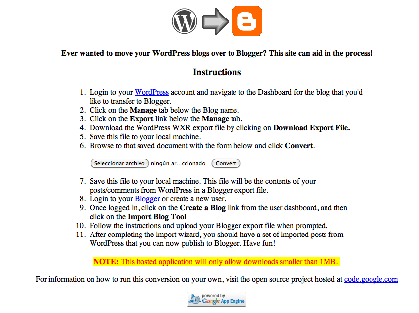 Para ello tenemos que ir a la aplicación web que encontrarás en . Allí, además de los pasos para la migración (en inglés) tienes un conversor de WordPress a Blogger. Simplemente cargas tu fichero recién exportado y luego pulsas el botón «Convert». ¡Ojo!, el conversor dice solo sirve para ficheros de menos de 1 Mb, si tu archivo de exportación es mayor tendrás que hacer algún apaño. No obstante, yo he cargado un fichero de más de 2 Mb y ha funcionado, prueba a ver si tienes suerte, como yo.