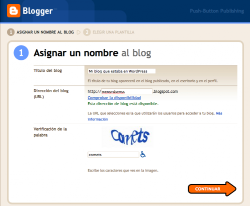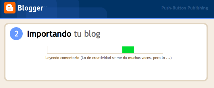 Ahora hay que ir al escritorio de Blogger y hacer clic en el botón de «Crear un blog» o, si ya lo tienes, acceder a la herramienta de importación de Blogger, eliges el fichero resultante de la conversión, rellenas el captcha y pulsas el botón «Importar blog» y esperas a que termine de moverse la barrita verde.