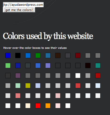 Es como un buscador de colores de webs en el que solo tienes que teclear la URL de tu web favorita para que te muestre todos los colores que utiliza y, lo mas interesante, al pasar el cursor sobre cada color te muestra el código correspondiente.