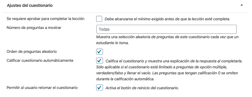 Y, más abajo, puedes especificar algunos ajustes para los cuestionarios, como si será obligatorio aprobarlos para pasar la lección, por ejemplo.