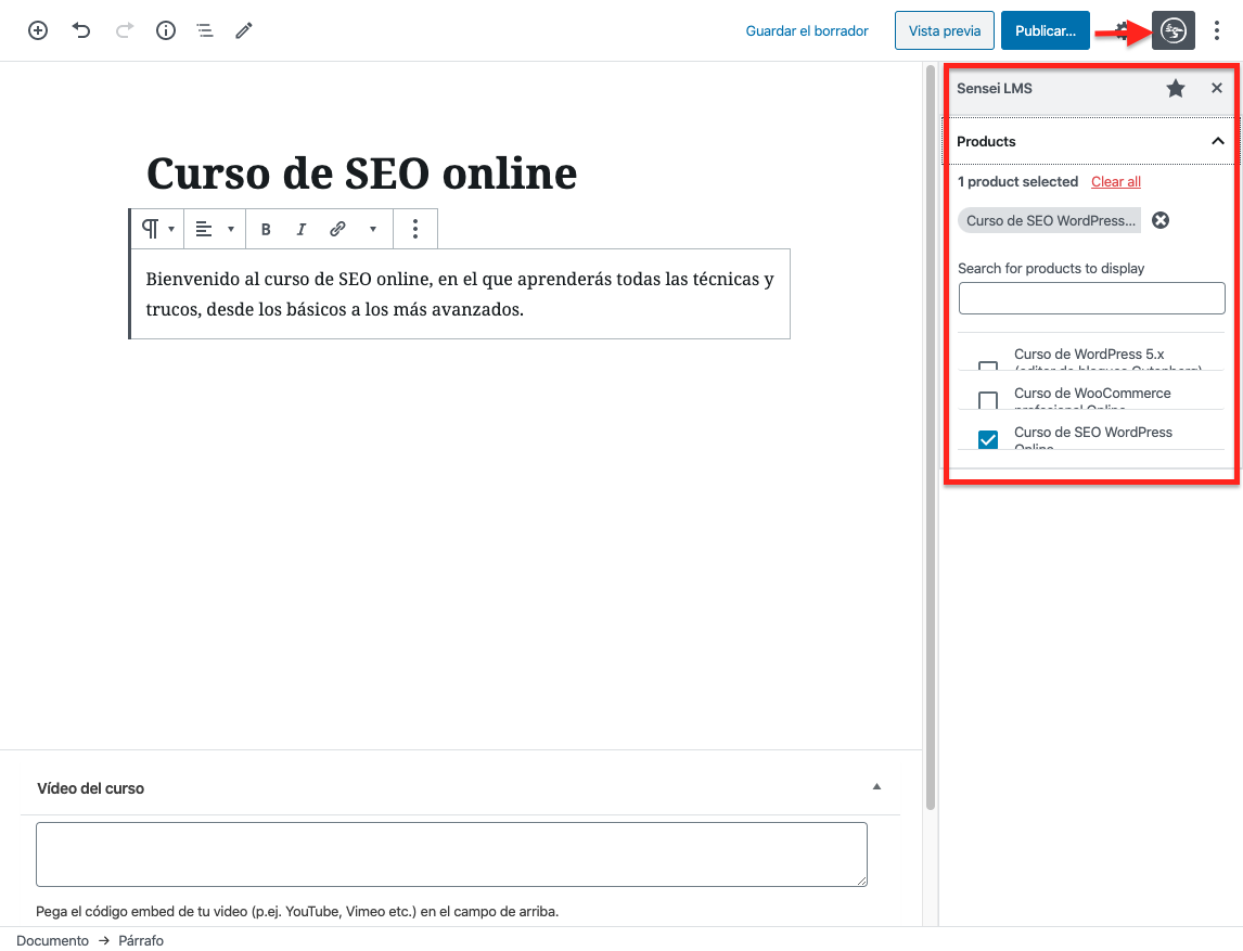 Para finalizar, y lo más importante, los ajustes de Sensei, dónde debes asignar a qué producto de WooCommerce estará asociado el curso, qué producto hay que comprar para poder acceder al curso.