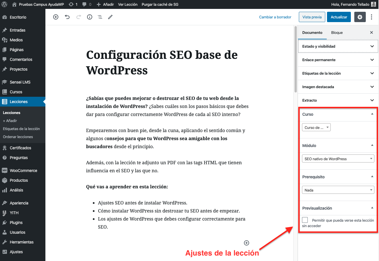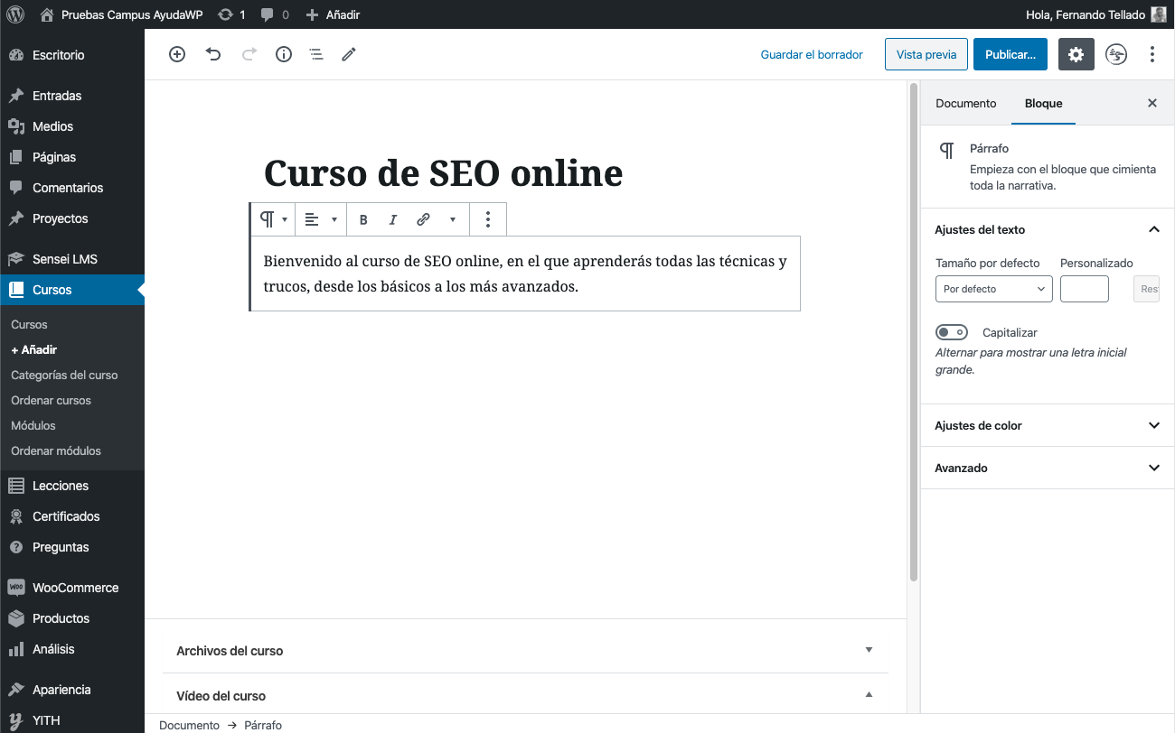 Desde el menú Lecciones > Añadir abrirás el editor de WordPress, con los elementos habituales, más los específicos de Sensei.