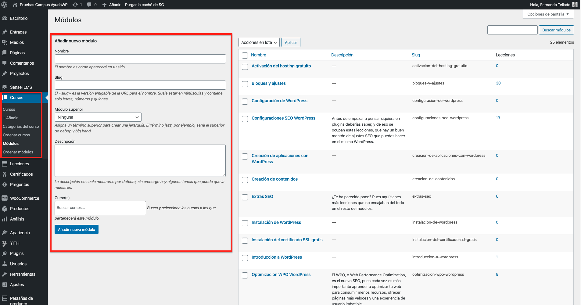 Solo tienes que ir al menú Cursos > Módulos y crear tantos como partes tenga tu curso o cursos.