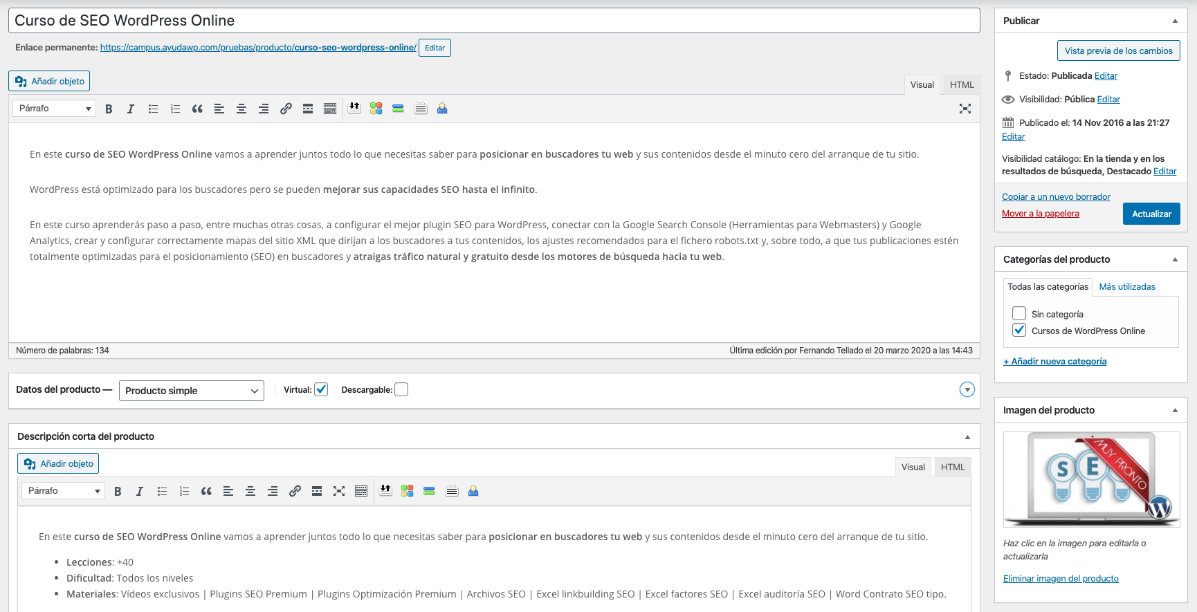 Antes de nada hay que crear el producto que habrá que pagar para poder acceder al curso, y crearlo es igual de sencillo que crear un producto simple de WooCommerce.