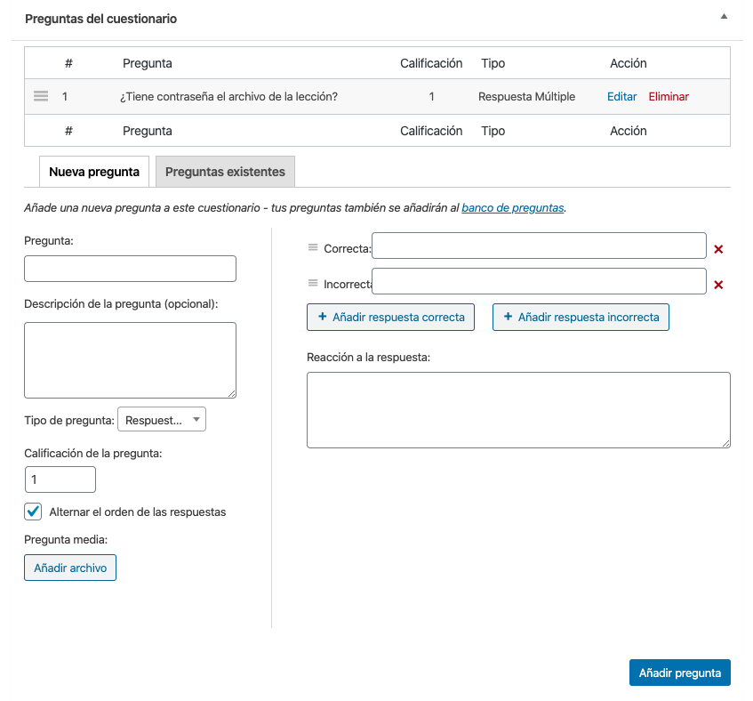 Crearlos es enormemente sencillo, solo tienes que rellenar los campos según el tipo de cuestionario que elijas, ponerle valoración si quieres, y añadirlo.