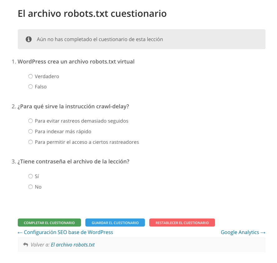 Una característica opcional que puedes incorporar en tus lecciones son los cuestionarios, pudiendo elegir entre los siguientes tipos:
