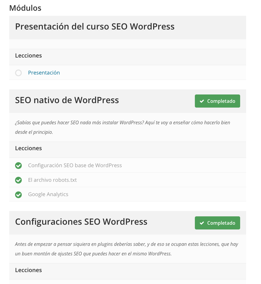 Puede haber cursos, con pocas lecciones en los que no haga falta organizarlas en módulos, pero si tienes – digamos – más de 5 lecciones, mi consejo es que las organices en módulos.