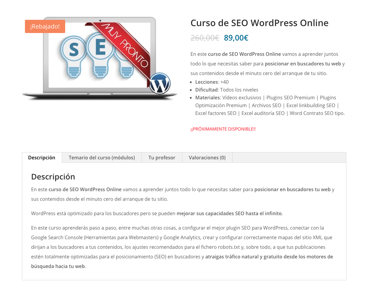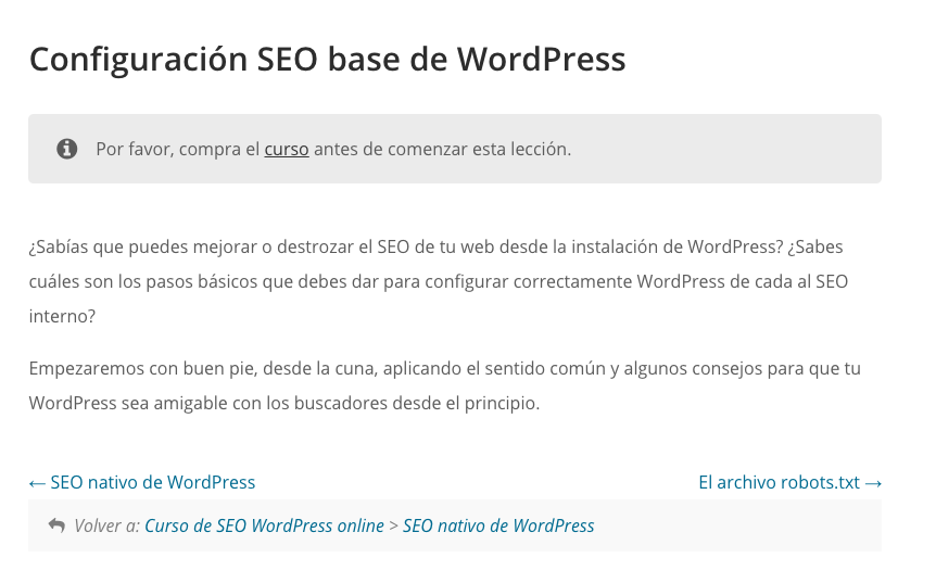 Pero ten en cuenta que la página buena, dónde de verdad el alumno verá el temario, será la página del curso, donde aparezcan todas las lecciones y la descripción de cada una.