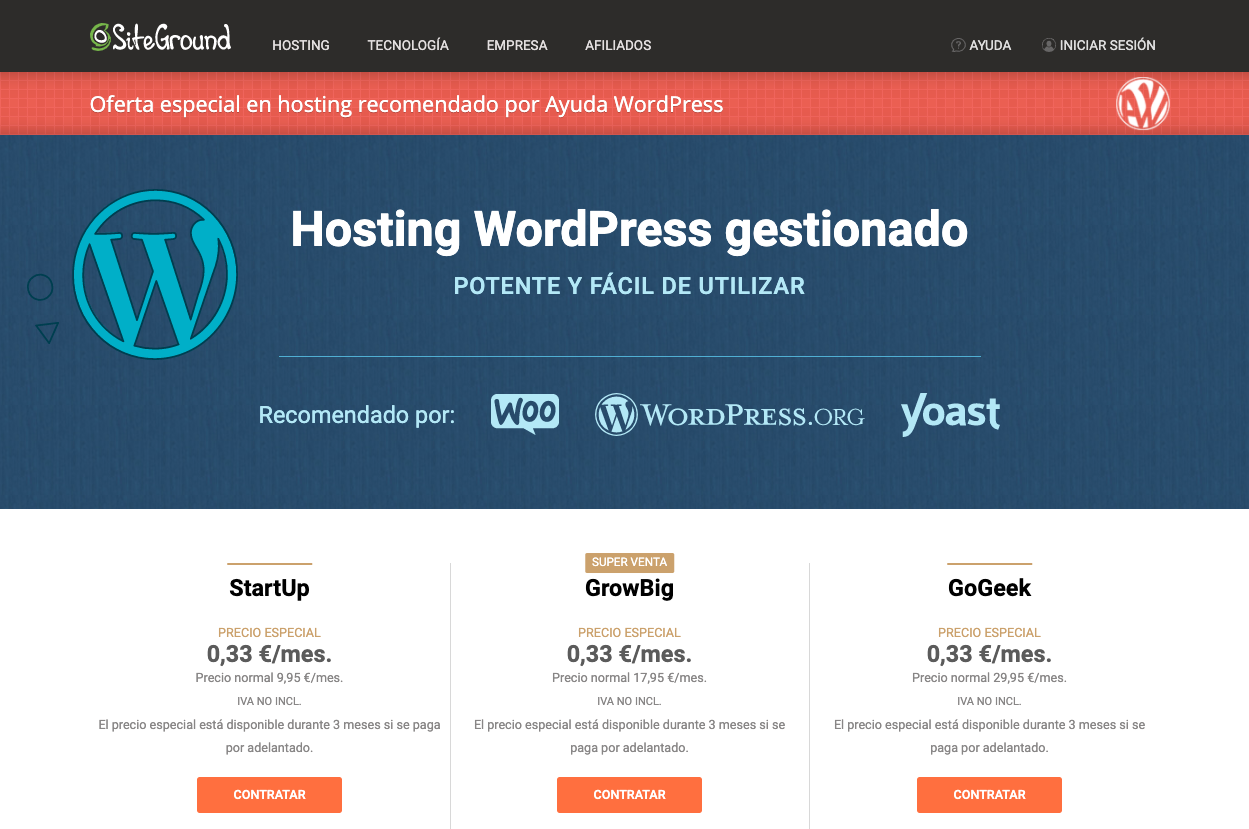 Mi recomendación ahora mismo, que cumpla estos básicos, a un precio imbatible, es SiteGround, que ahora mismo tiene una oferta de 3 meses por menos de 1 euro, así que no hay mejor modo de empezar.