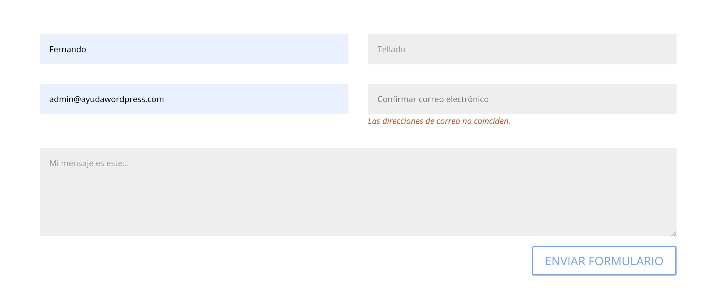 Ahora ya tenemos un formulario con dos campos de correo electrónico, y en uno de ellos además hemos sido muy coquetos y le hemos puesto un texto para que quede claro que es para confirmar el correo, pero algo falla: deja enviar los correos aunque el cliente ponga distintos emails.