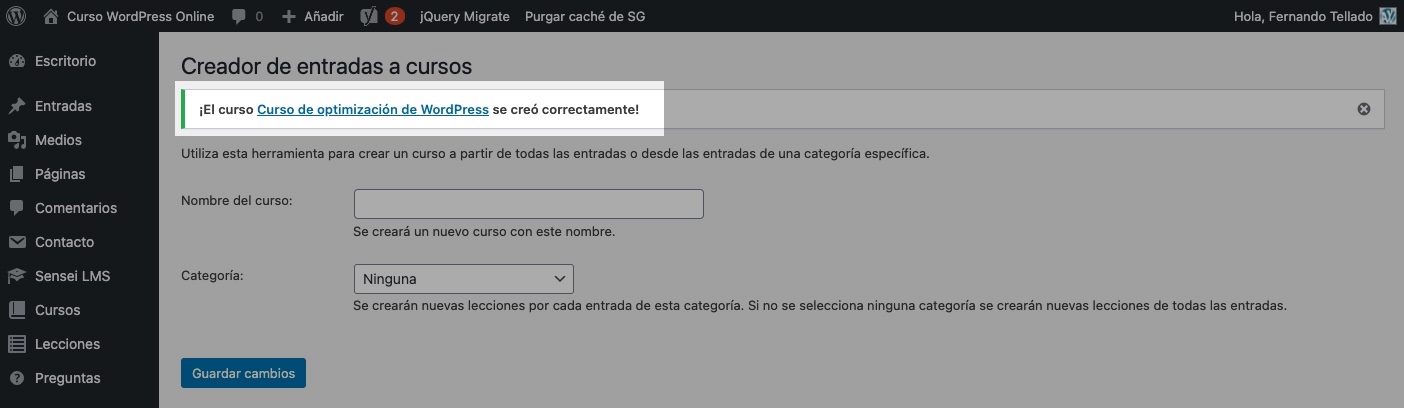 Cuando hayas configurado tus opciones simplemente guarda los cambios y se crea automáticamente el curso con las lecciones a partir de la categoría seleccionada.