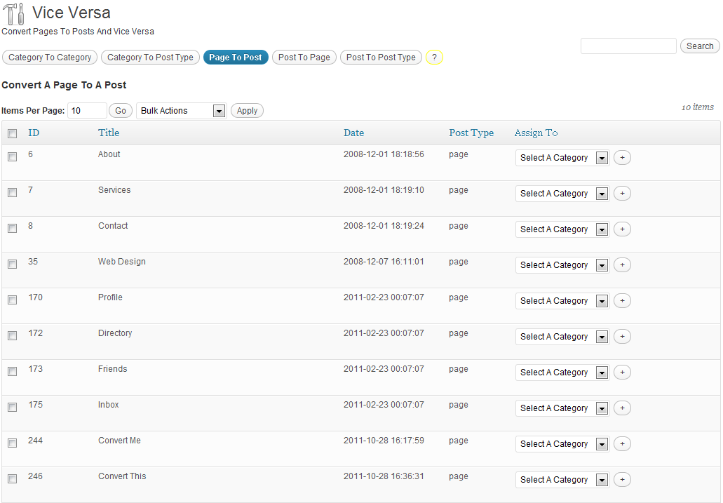 - Vice versa es otro plugin, que hace exactamente lo mismo que el anterior, convierte entradas en páginas y páginas en entradas. Como ventaja sobre el anterior puedes asignar categorías o páginas superiores, si lo deseas.