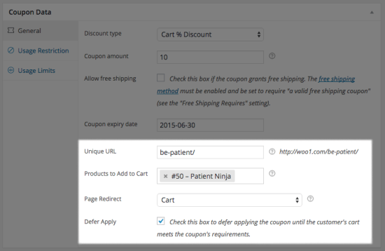 Este plugin sirve para mejorar la funcionalidad de cupones, y además de poder automatizar la aplicación de cupones o restringir su uso por métodos de envío y más parámetros, también incluye la utilidad de crear URLs para aplicar cupones a productos.